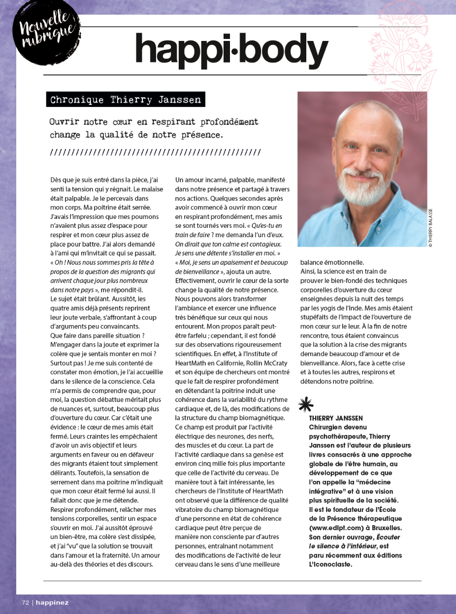Chirurgien devenu psychothérapeute spécialisé dans l’accompagnement des patients atteints de maladies physiques, Thierry Janssen est l’auteur de plusieurs livres consacrés à une approche globale de l’être humain, au développement de ce que l’on appelle la « médecine intégrative » et à une vision plus spirituelle de la société. Il est le fondateur de l’École de la posture juste (anciennement École de la Présence thérapeutique (EDLPT)), à Bruxelles (https://edlpj.org).